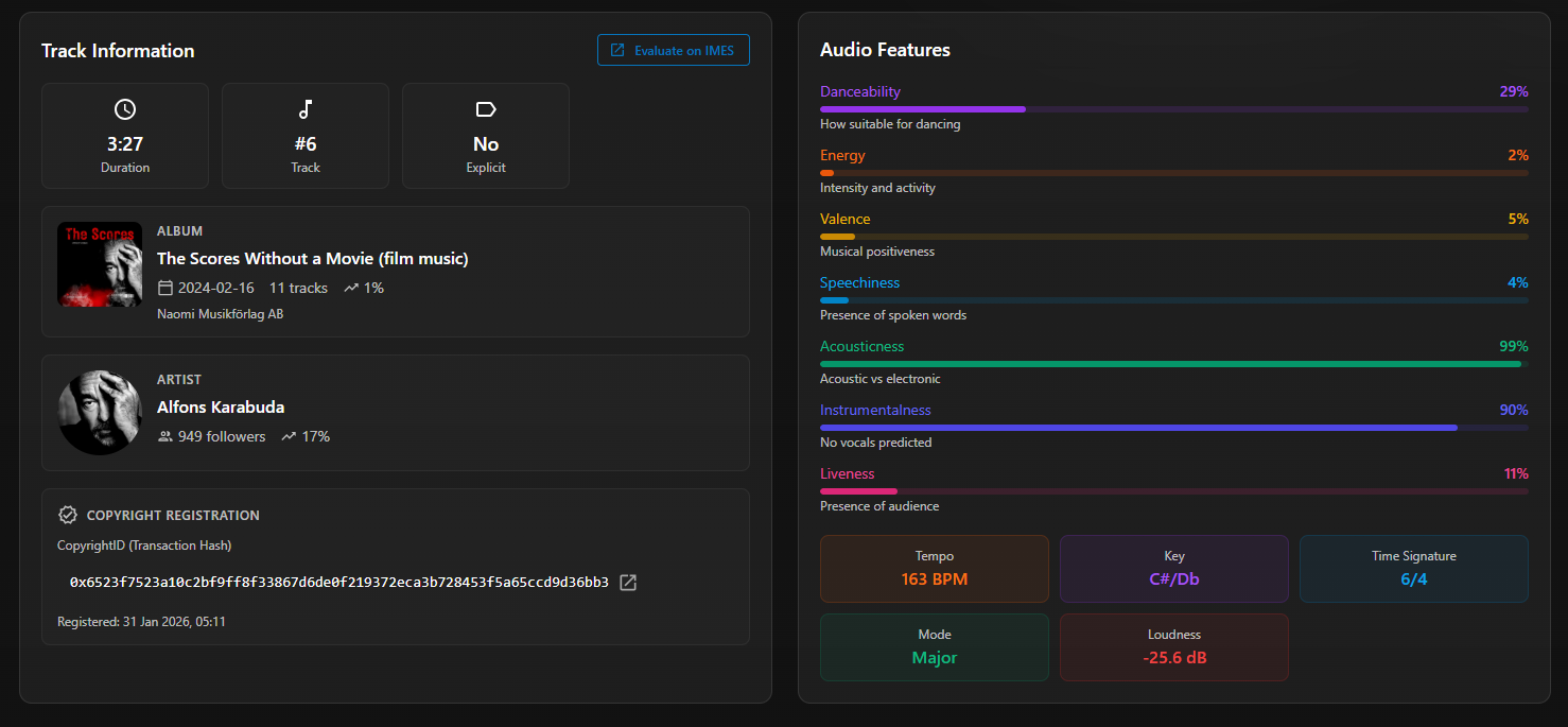 The cryptographic verification matters because financial institutions, courts, and investment funds require independently verifiable data. Streaming platforms control their own metrics. Evaluation data exists on immutable infrastructure that any party can verify through public explorers. This independence creates trust across transactions where parties have competing interests.