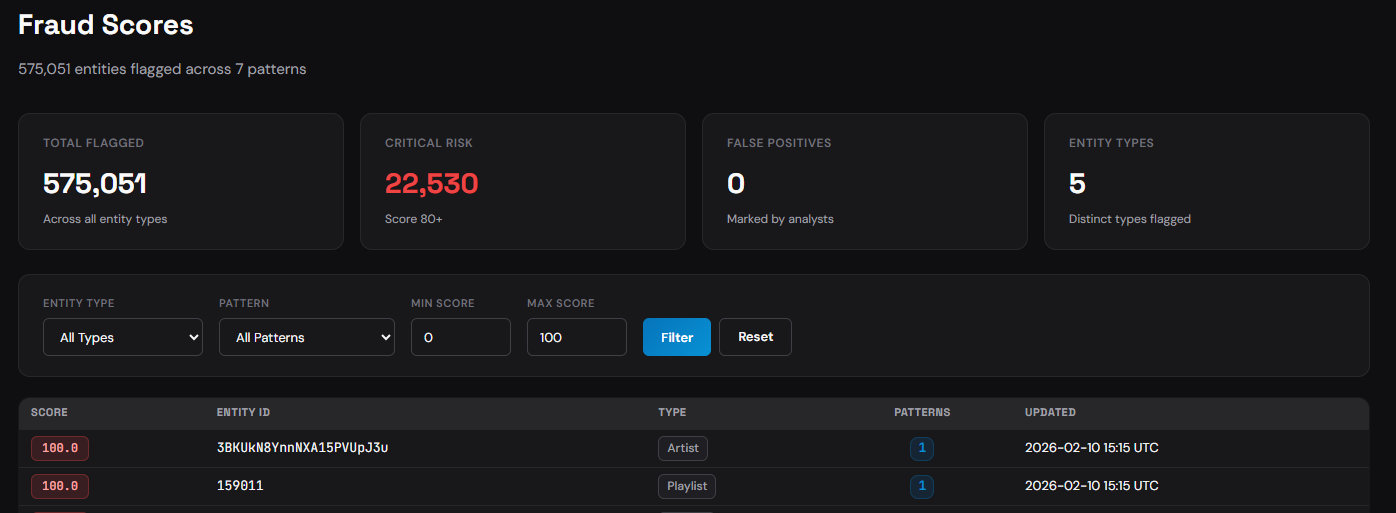 The system examined 575,051 entities, including tracks, playlists, artists, albums, and playlist owners. Seven fraud detection algorithms were applied simultaneously to this data, producing a risk score ranging from 0 to 100 for each entity.