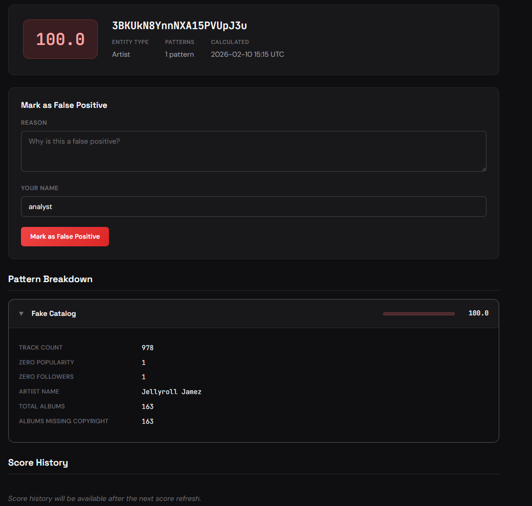 - Fake catalog identification: Detects fabricated artist profiles.